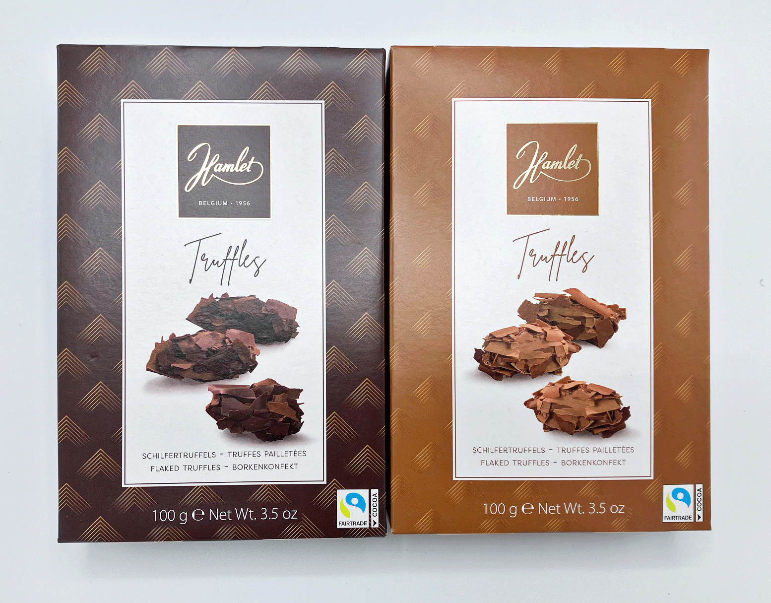 Hamlet truffles are made from Belgian chocolate. They have a creamy filling and are generously sprinkled with fine pieces of chocolate. A classic that always scores well with young and old! These chocolates are made in Belgium from Fairtrade cocoa.
