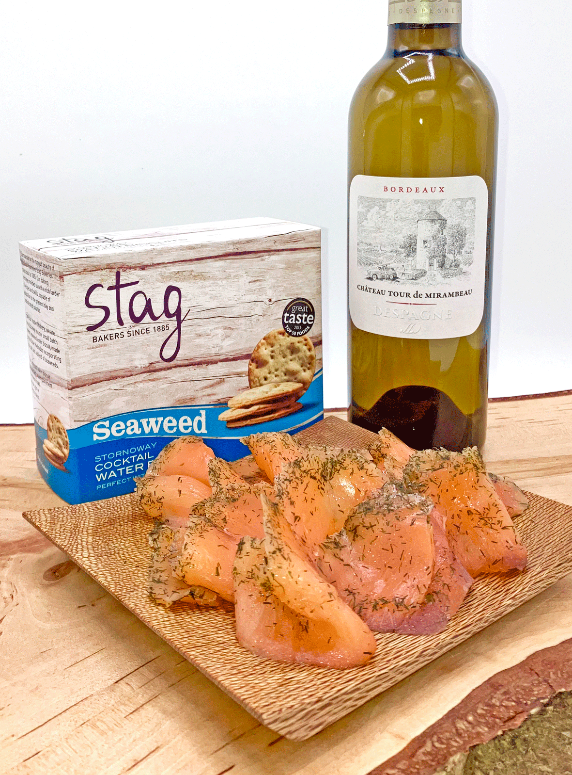 A delicious combination of Château de Mirambeau Bordeaux Blanc Reserve, our unique Hebridean Gravlax and Stag Bakery Seaweed Water Biscuits. This fresh and lively Sauvignon blanc led wine is a very good partner for the delicate gravlax and the subtle seaweed biscuits.